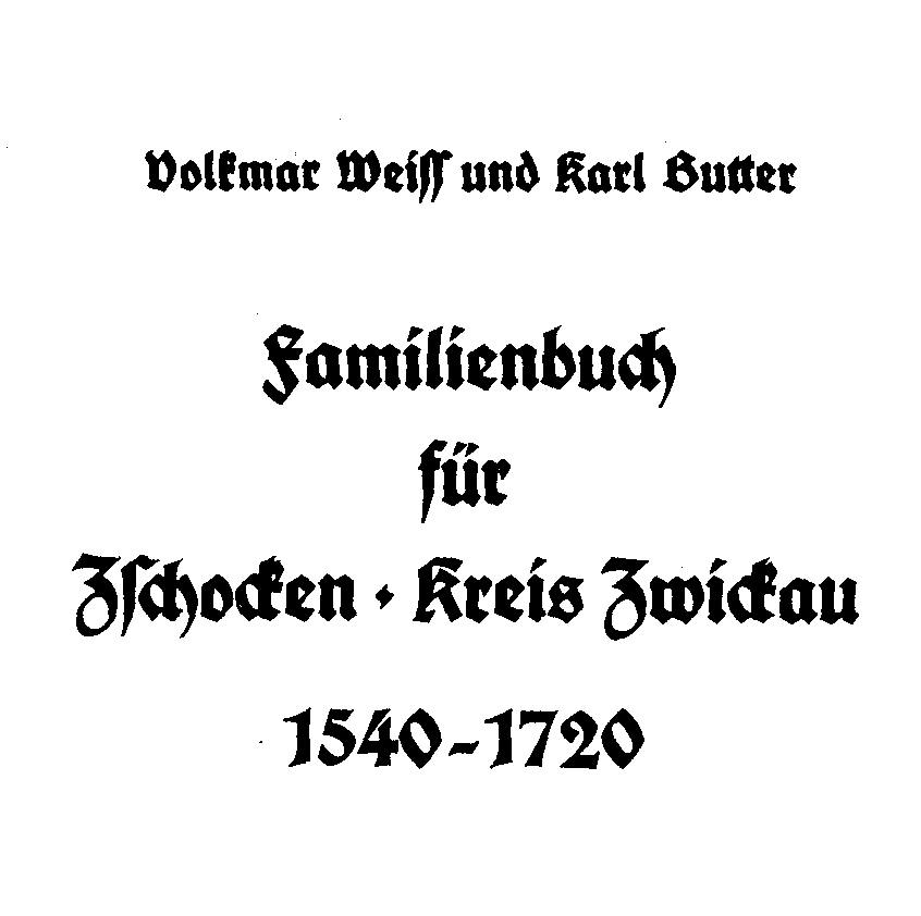 | Zschocken/141/1988/1540-1720 (L) Weiss, Volkmar/Butter, Karl: Familienbuch für Zschocken, Kreis Zwickau, 1540-1720. Leipzig 1988; Reihe: Quellen und Forschungen zur sächsischen Geschichte, Bd. 9; 84 S.; 646 Fam ST DZfG/DB Leipzig (SB 6693 9), Fr/M.: D 89b/4573, Mannheim, Staatsbibliothek preuß. Kulturbesitz Berlin Sig.: 1B 3028, Stuttgart: Verein f. Fam.- und Wappenkunde Die KB beginnen in Zschocken erst nach 1700. Das Familienbuch wurde von den Autoren mittels Auswertung der Gerichtsbücher von Zschocken unter Einbeziehung der KB und GB der benachbarten Orte erstellt. |